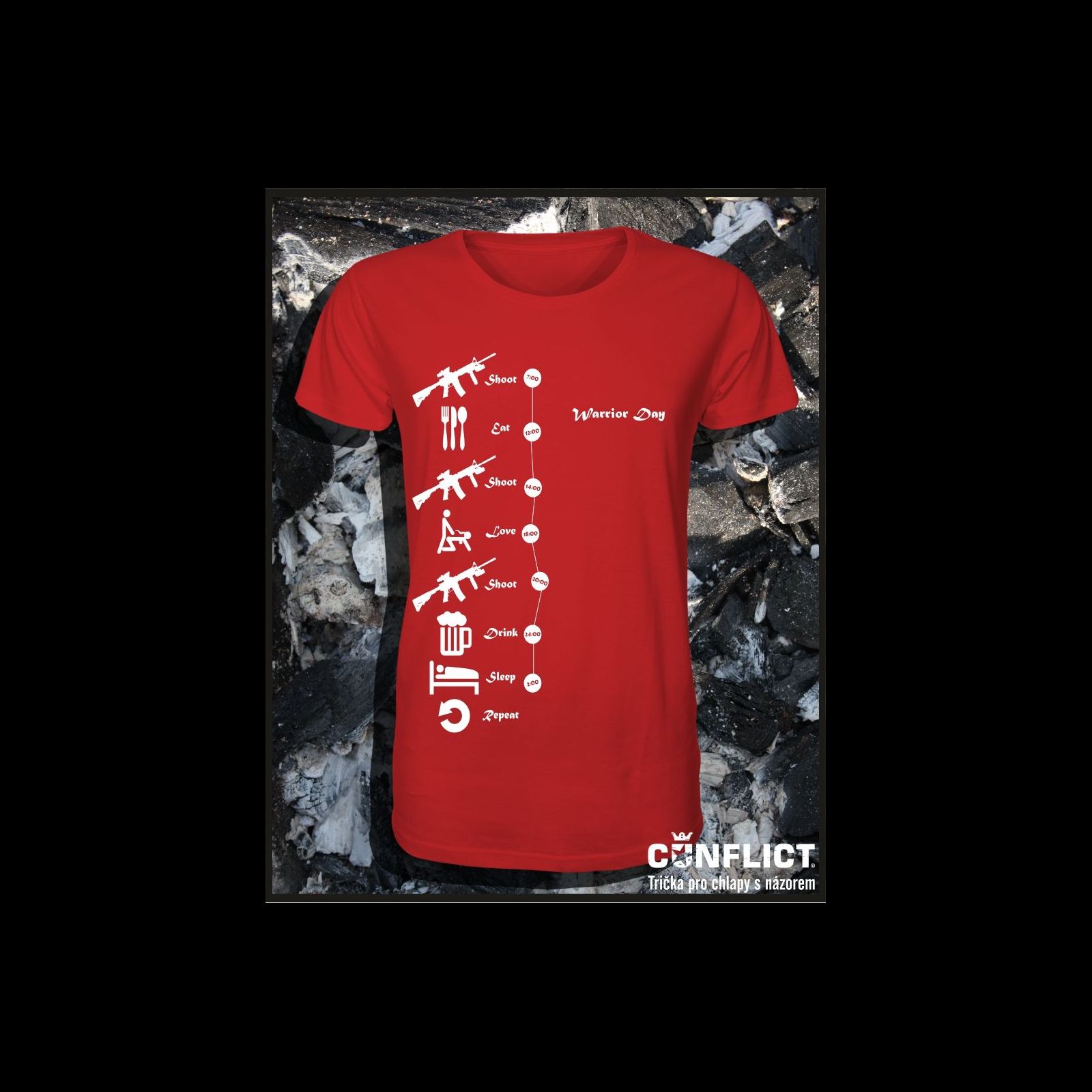 - hlavní velký potisk je vepředu napravo - rozvrh dne válečníka, na levém prsu je pak doplňující text Warrior Day