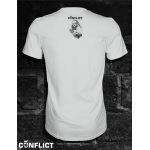 - Hlavní motiv je vepředu na tričku v plnobarevné verzi a jeho jednobarevná a zmenšená varianta je na zádech nad lopatkami včetně loga CONFLICT.