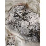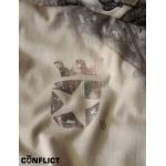 - Hlavní motiv je vepředu na tričku v plnobarevné verzi a jeho jednobarevná a zmenšená varianta je na zádech nad lopatkami včetně loga CONFLICT.