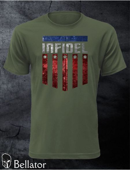 - Hlavní motiv trička je složen z nápisu Infidel a štítu. Na zádech je logo Bellator.