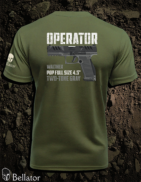 - Vepředu na levém prsu je vyobrazena zbraň Walther DPD Full Size 4.5 Two-Tone Gray. Hlavní motiv zbraně je umístěn na zádech spolu s nápisem OPERATOR.
