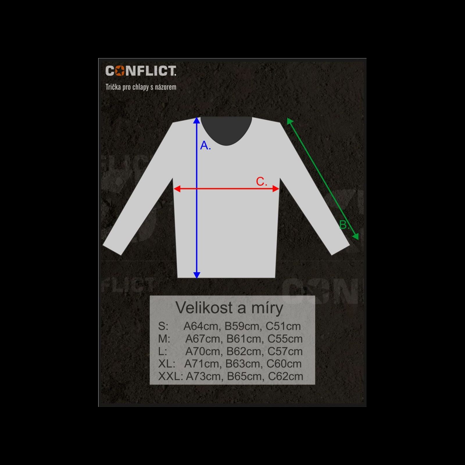 - Svetr má na přední části v pravé straně postavu vojáka dívajícího se na logo CONFLICT, které je na levém prsu.