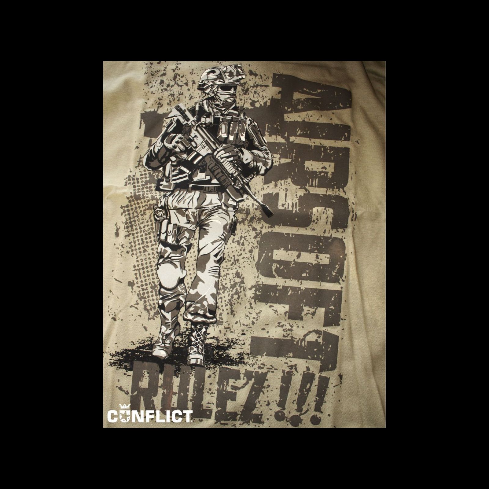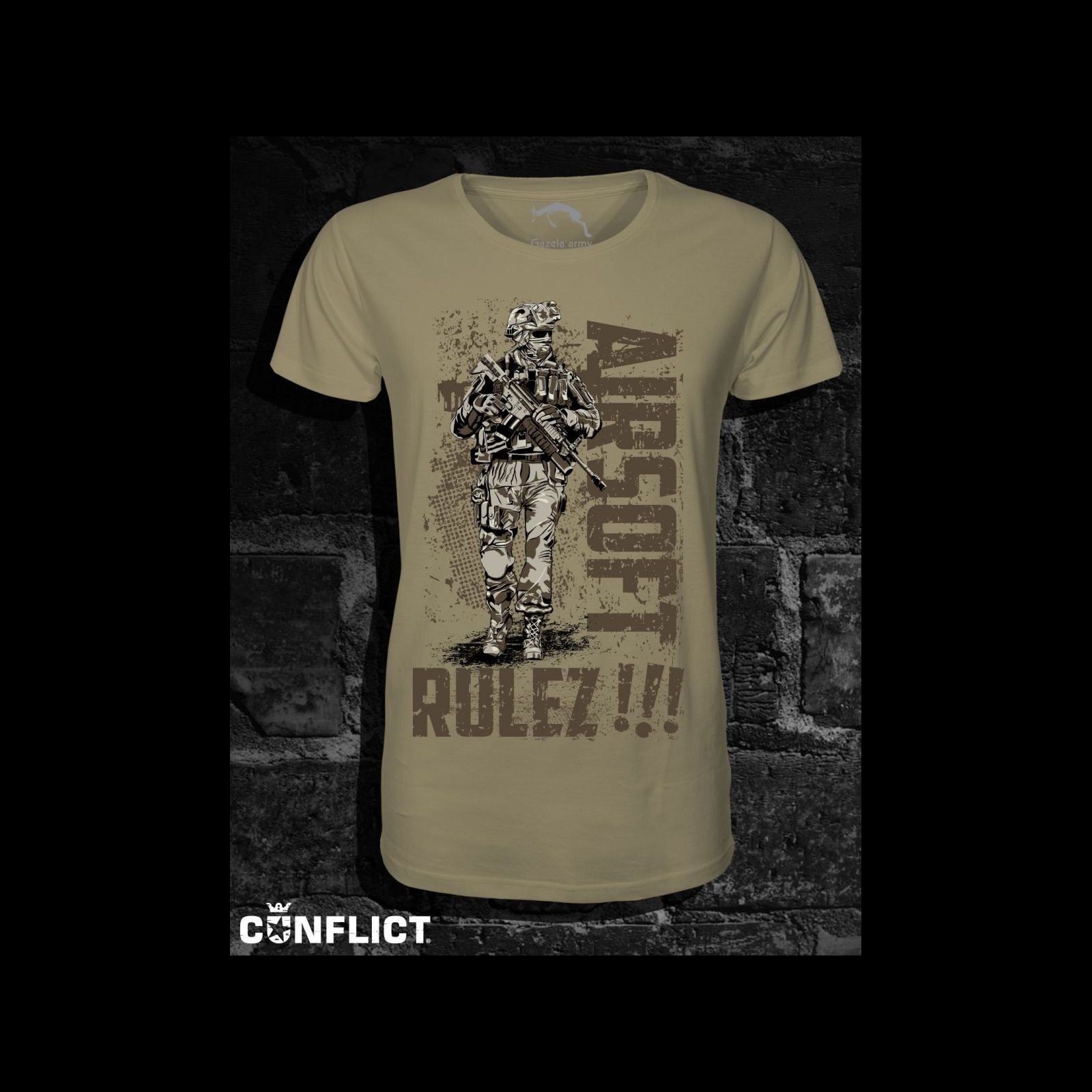 - The t-shirt has a large print of a soldier on the front with the inscription Airsoft rulez!