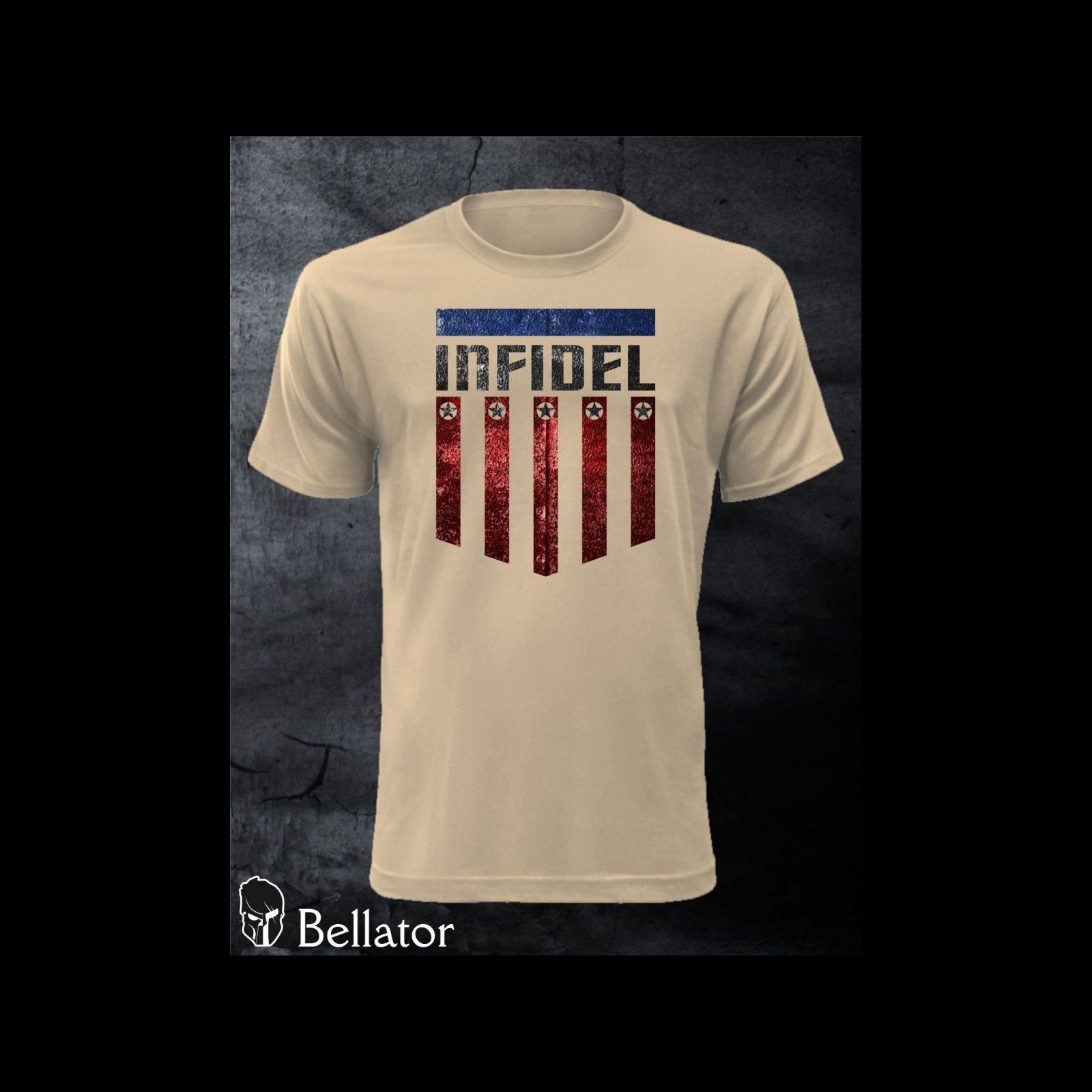 - The main motif of the t-shirt is composed of the inscription Infidel and a shield. Bellator logo on the back.
