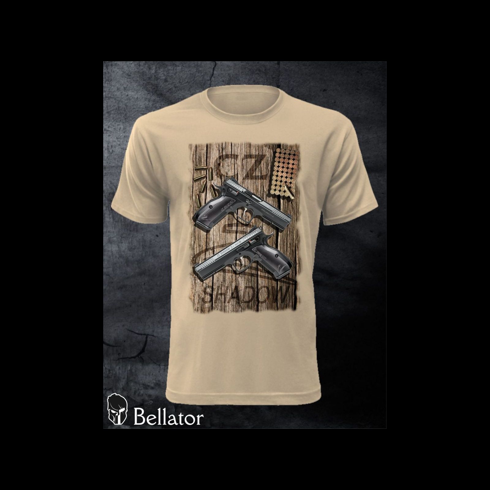 - The main motif of the t-shirt consists of two images of this weapon, cartridges and the inscription "CZ Shadow 2", on the back above the shoulder blades the Bellator logo.