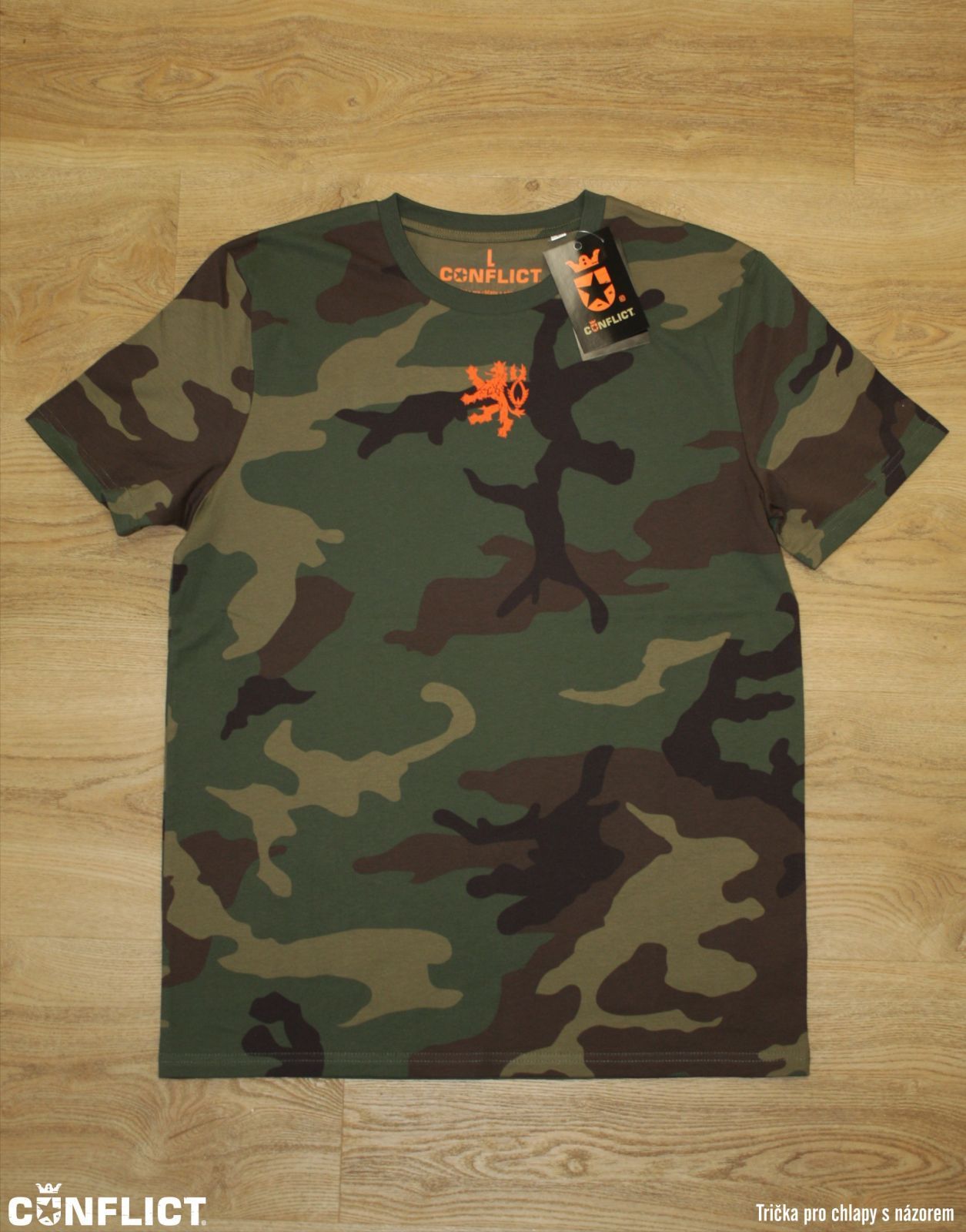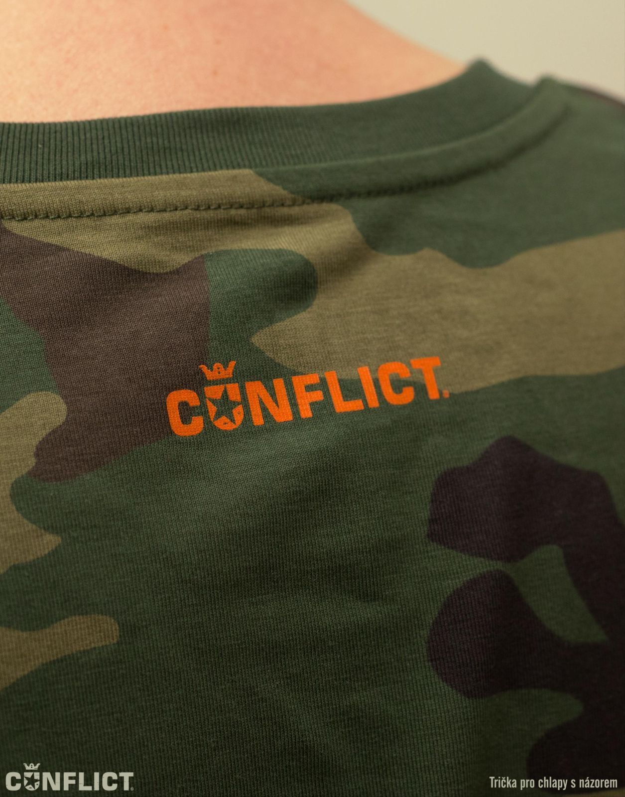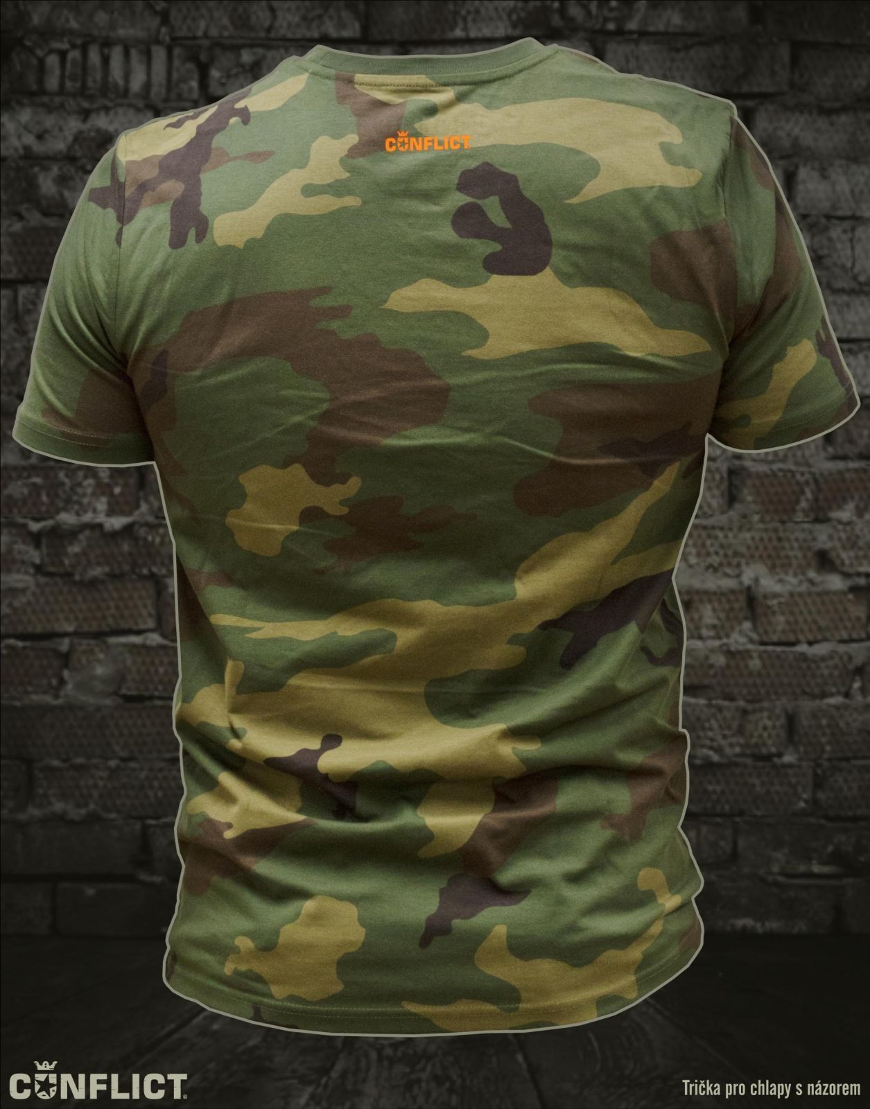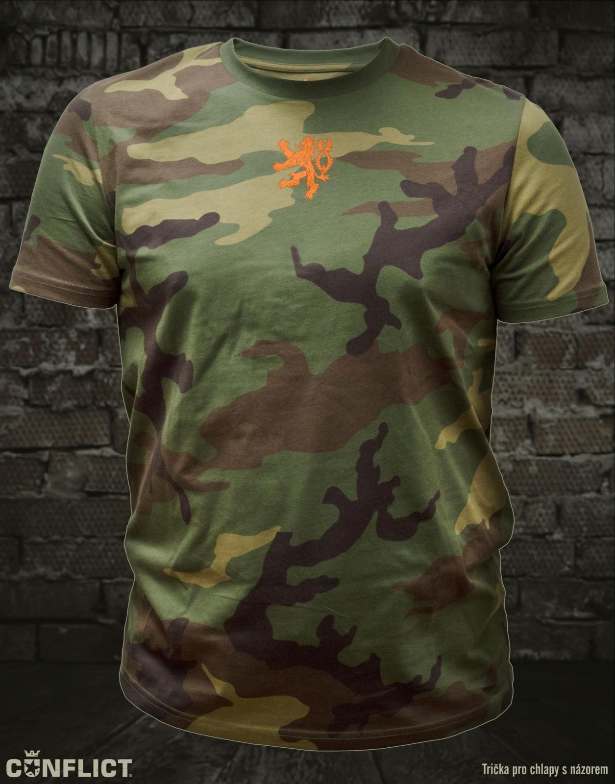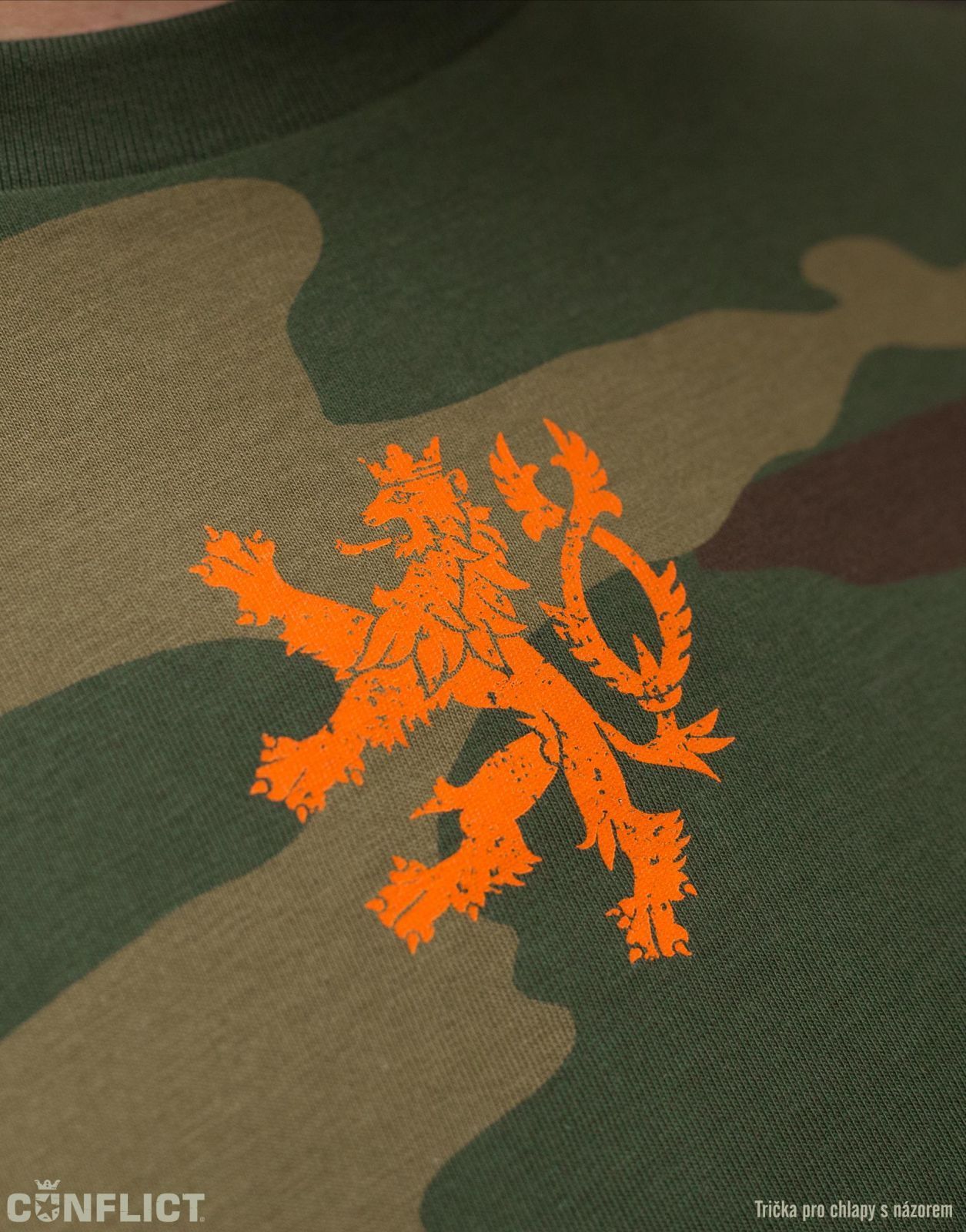 - Tričko má na sobě vepředu potisk Českého lva v oranžové / střelecké barvě, na zádech je oranžové logo Conflict