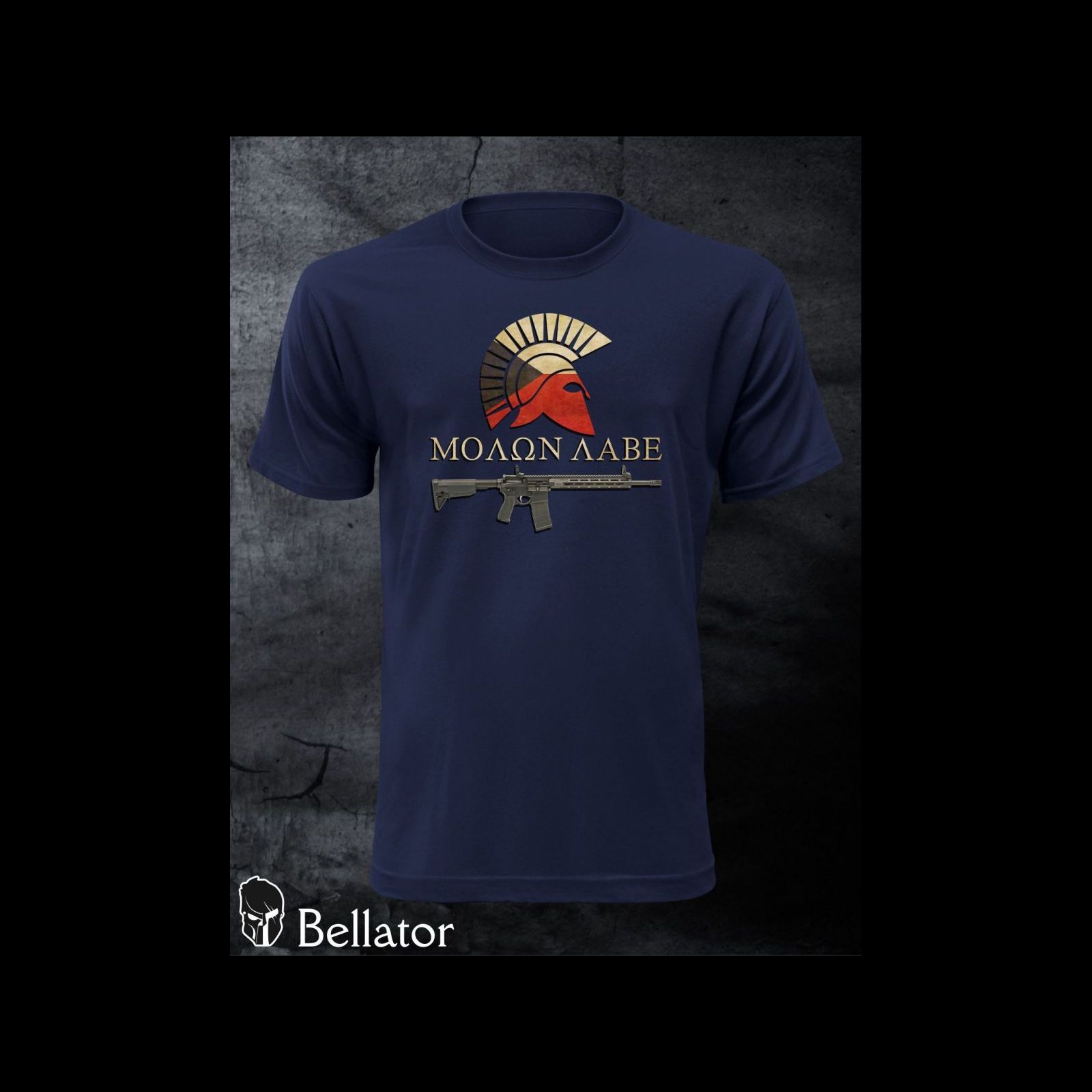 - Tričko má vpředu potisk spratské přilby v barvách české vlajky, automatické pušky a nápis "MOLON LABE" (přijďte si pro ně).