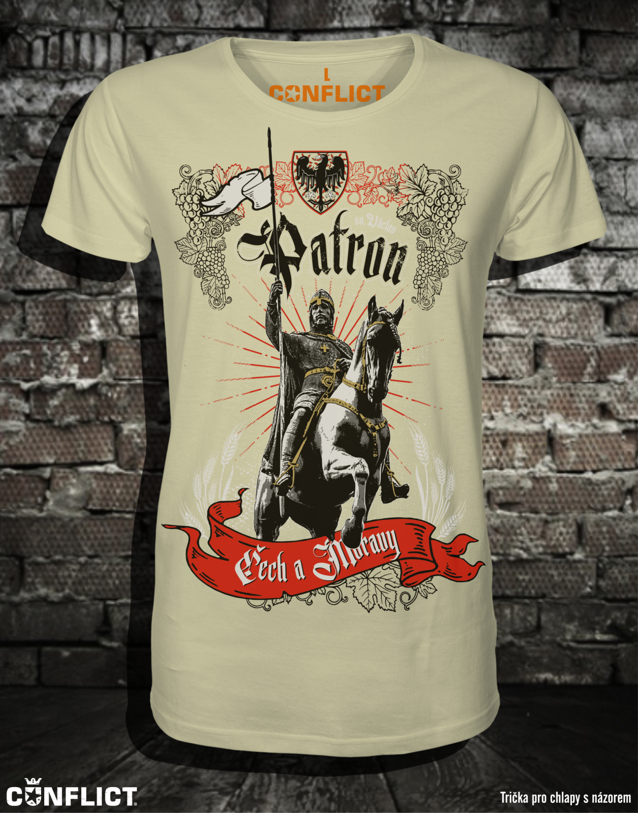 - Tričko má vepředu potisk svatého Václava na koni a na zádech nápis s malý logem Conflict
